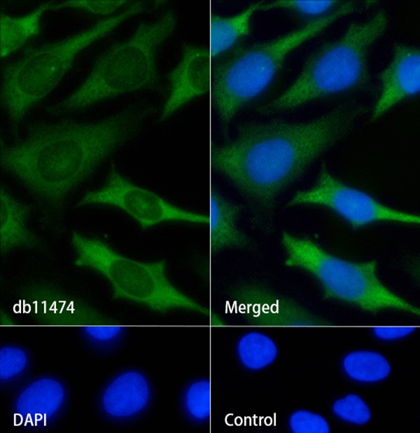 The cells were fixed with cold 100% methanol (10min, 4℃) and blocked in 1% BSA/10% normal goat serum/0.3M glycine in 0.1% PBS-Tween 20 for 1h. The cells were then incubate with db11474 (1:200) at room temprature for 1h, followed by a further incubation at room temperature for 45min with Goat Anti Rabbit lgG (H+L)-AF488 (