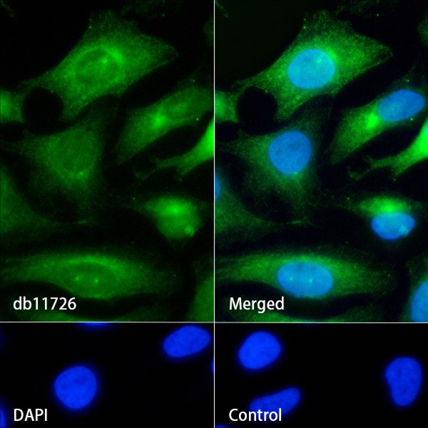 The cells were fixed with 4% PFA (10min, RT) followed by treatment with 0.1% Triton X-100 (10min, RT), and blocked in 1% BSA/10% normal goat serum/0.3M glycine in 0.1% PBS-Tween 20 for 1h. The cells were then incubate with db11726 (1:20) at room temprature for 1h, followed by a further incubation at room temperature for 45min with Goat Anti Rabbit lgG (H+L)-AF488 ( db10005, shown in green). Nuclear DNA was labeled in blue with DAPI.