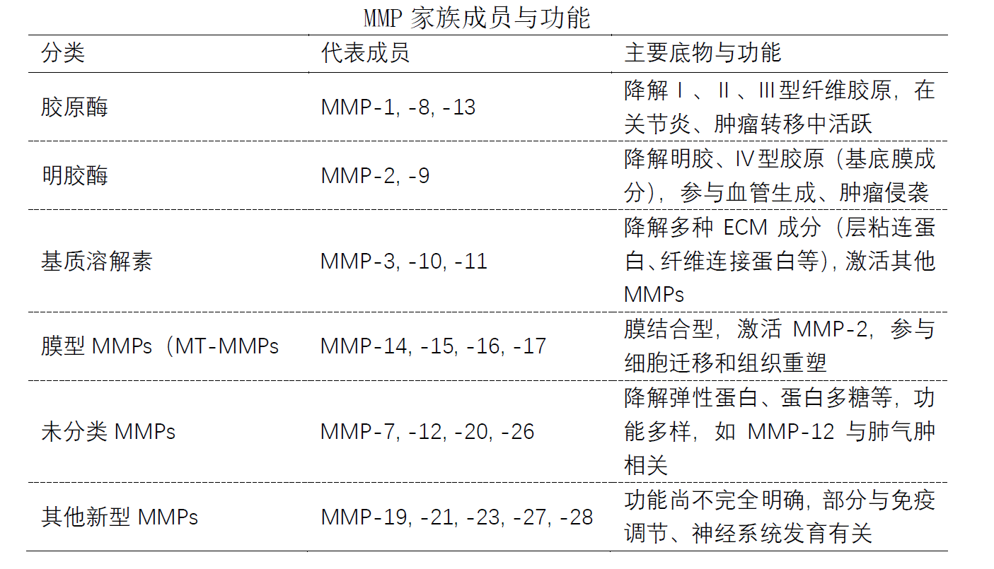 MMP家族包含26个成员,可根据酶作用底物不同分为胶原酶、明胶酶等6类,具体家族成员与功能见下表。