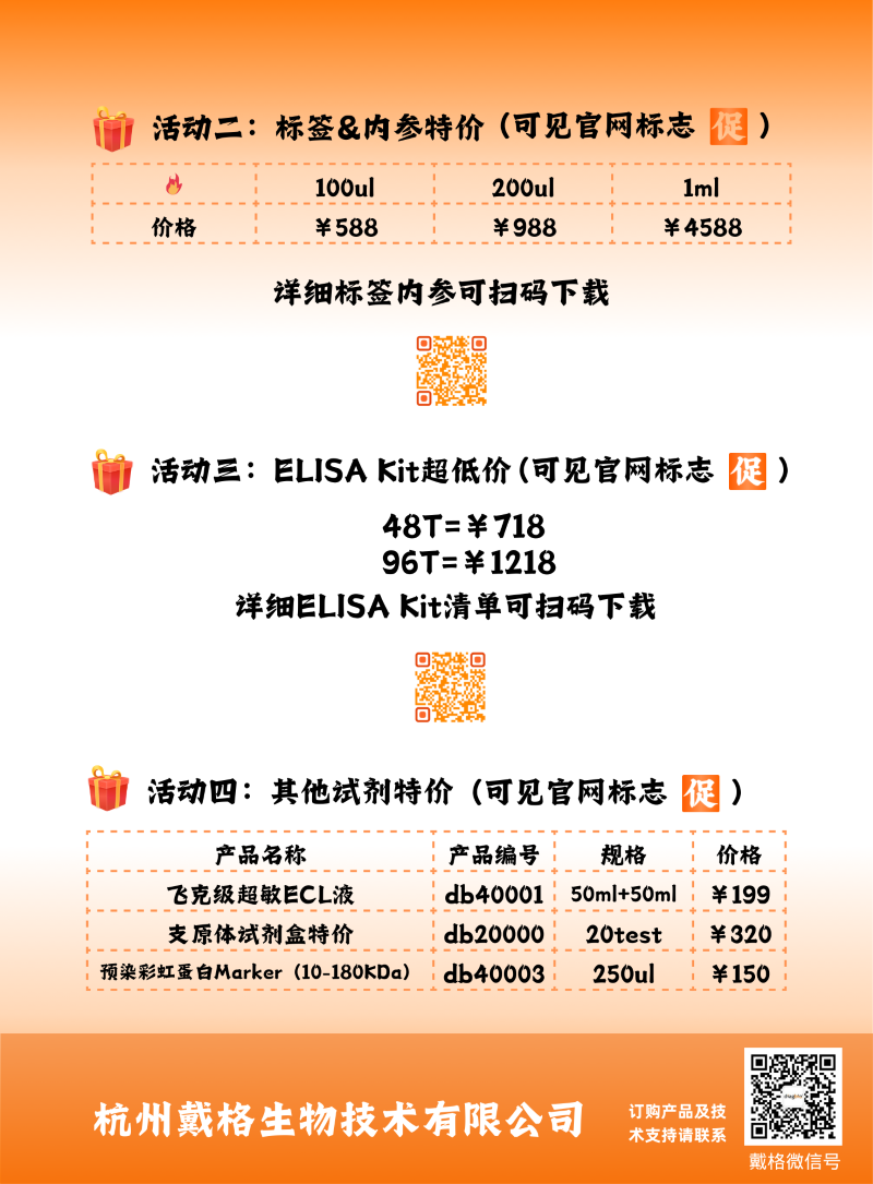 活动包括:20ul/50ul/100ul多规格特价回归,标签内参特价,ELISA Kit超低价,飞克级超敏ECL液特价,支原体试剂盒特价以及预染彩虹蛋白Marker特价!
