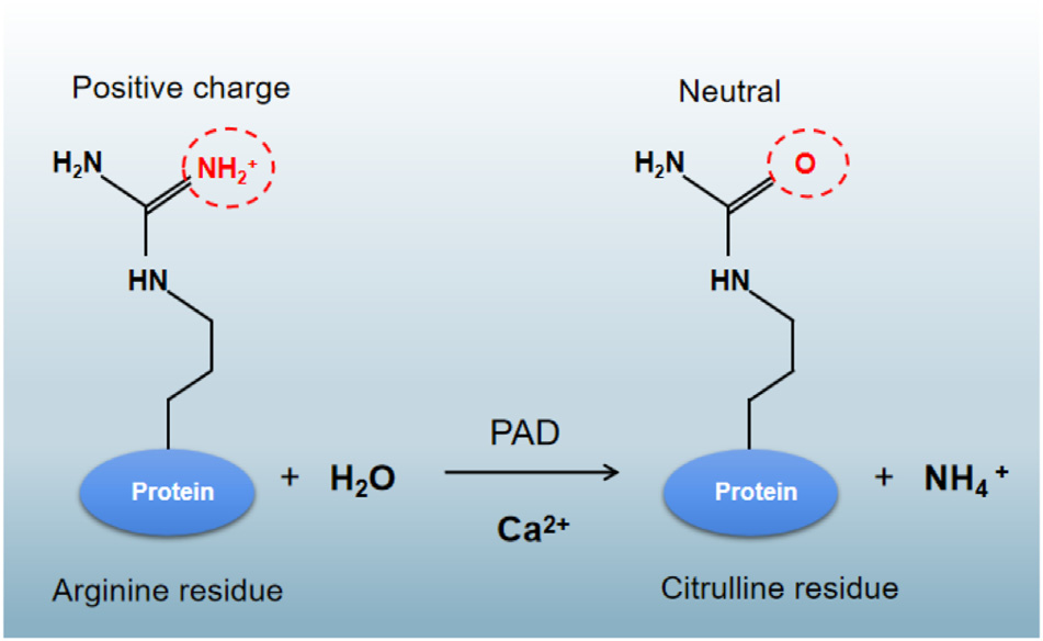 瓜氨酸化是一种由肽基精氨酸脱亚胺酶(Peptidylarginine Deiminases, PADs)催化的能将蛋白质中的精氨酸残基(Arginine, Arg)转化为瓜氨酸(Citrulline, Cit)的重要翻译后修饰过程。此过程消耗一个水分子并释放氨且需要Ca+的辅助活化,精氨酸的正电荷被中性的瓜氨酸所取代,导致蛋白质结构和功能发生改变。
