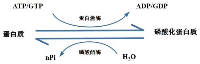 磷酸化是细胞内最常见的也是最重要的蛋白质翻译后修饰之一。在真核细胞中,大约1/3的蛋白质会被磷酸化。蛋白质磷酸化是通过蛋白激酶催化将ATP或GTP的γ位磷酸基转移到底物蛋白质的氨基酸残基上(主要是丝氨酸、苏氨酸和酪氨酸)上的过程。并且这一过程是可逆的,其逆过程由蛋白磷酸酯酶催化,称为蛋白质去磷酸化。