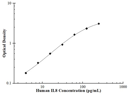 Example of Human IL8 standard curve. Background-subtracted data values (mean +/- SD) are graphed.