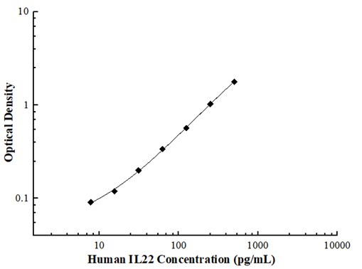 Example of Human IL22 standard curve. Background-subtracted data values (mean +/- SD) are graphed.