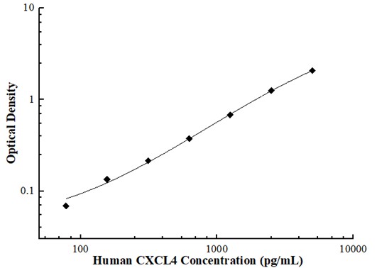 Example of Human CXCL4 standard curve. Background-subtracted data values (mean +/- SD) are graphed.