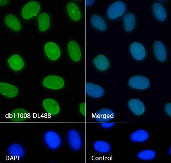 Immunofluorescence analysis of HeLa cells labelling Lamin A/C with db11008-DL488.