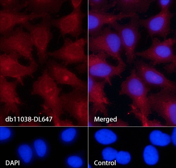 The cells were fixed with cold 100% methanol (10min, 4℃) and blocked in 1% BSA/10% normal goat serum/0.3M glycine in 0.1% PBS-Tween 20 for 1h. The cells were then incubate with db11038-DL647 (1:200,shown in red) at room temprature for 1h. Nuclear DNA was labeled in blue with DAPI.