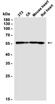 Western blot analysis of extracts from 3T3, C6 cells and Mouse heart, Rat heart tissues using db11062 at 1:1000.