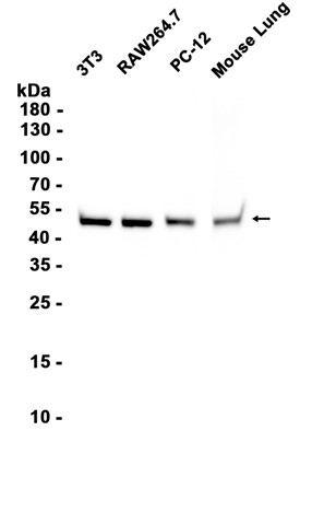 Western blot analysis of extracts from 3T3, RAW264.7, PC-12 and Mouse lung tissue using db11073 at 1:5000.