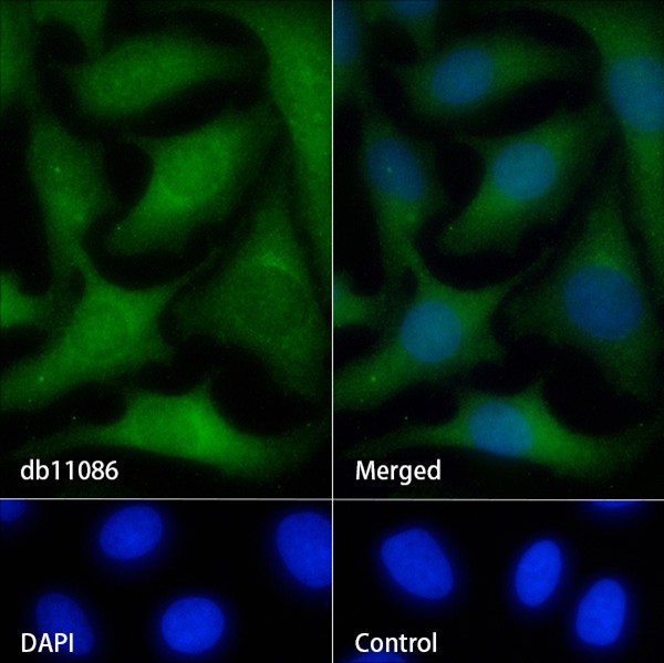 The cells were fixed with 4% PFA (10min, RT) followed by treatment with 0.1% Triton X-100 (10min, RT), and blocked in 1% BSA/10% normal goat serum/0.3M glycine in 0.1% PBS-Tween 20 for 1h. The cells were then incubate with db11086 (1:100) at room temprature for 1h, followed by a further incubation at room temperature for 45min with Goat Anti Rabbit lgG (H+L)-AF488 (