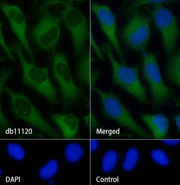 The cells were fixed with cold 100% methanol (10min, 4℃) and blocked in 1% BSA/10% normal goat serum/0.3M glycine in 0.1% PBS-Tween 20 for 1h. The cells were then incubate with db11120 (1:50) at room temprature for 1h, followed by a further incubation at room temperature for 45min with Goat Anti Rabbit lgG (H+L)-AF488 (