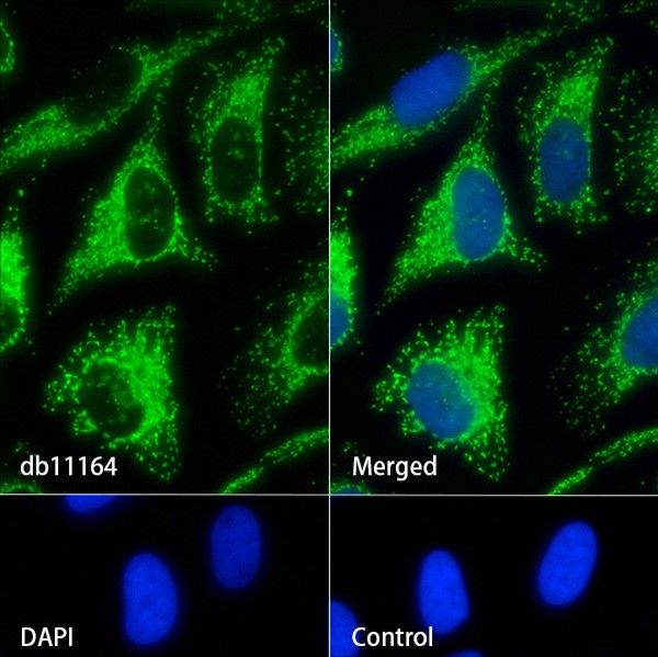 The cells were fixed with 4% PFA (10min, RT) followed by treatment with 0.1% Triton X-100 (10min, RT), and blocked in 1% BSA/10% normal goat serum/0.3M glycine in 0.1% PBS-Tween 20 for 1h. The cells were then incubate with db11164 (1:100) at room temprature for 1h, followed by a further incubation at room temperature for 45min with Goat Anti Rabbit lgG (H+L)-AF488 (