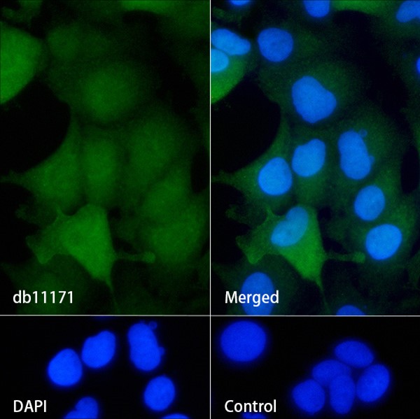 The cells were fixed with 4% PFA (10min, RT) followed by treatment with 0.1% Triton X-100 (10min, RT), and blocked in 1% BSA/10% normal goat serum/0.3M glycine in 0.1% PBS-Tween 20 for 1h. The cells were then incubate with db11171 (1:50) at room temprature for 1h, followed by a further incubation at room temperature for 45min with Goat Anti Rabbit lgG (H+L)-AF488 (