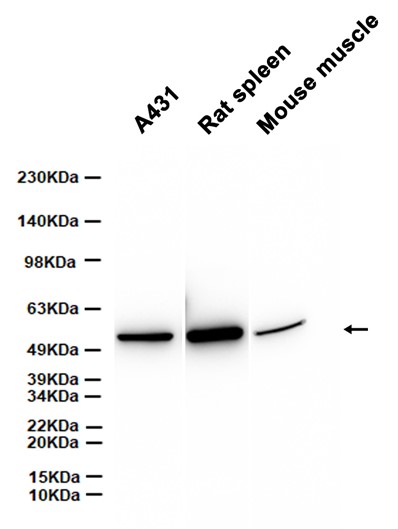Western blot analysis of extracts from A431 cells and Rat spleen,Mouse muscle tissue using db11200 at 1:1000.