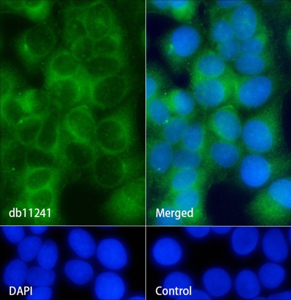 The cells were fixed with cold 100% methanol (10min, 4℃) and blocked in 1% BSA/10% normal goat serum/0.3M glycine in 0.1% PBS-Tween 20 for 1h. The cells were then incubate with db11241 (1:100) at room temprature for 1h, followed by a further incubation at room temperature for 45min with Goat Anti Rabbit lgG (H+L)-AF488 (