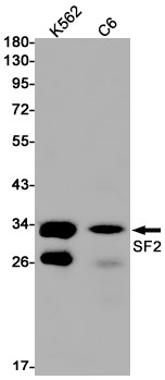 Western blot detection of SF2 in K562,C6 cell lysates using SF2 antibody(1:1000 diluted).