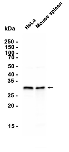 Western blot analysis of extracts from HeLa cells and Mouse spleen tissue using db11263 at 1:2000.
