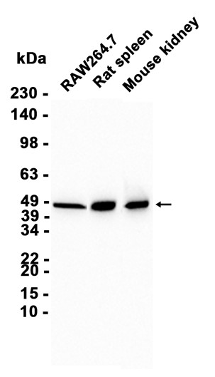 Western blot analysis of extracts from RAW264.7 cells and Rat spleen,Mouse kidney tissue using db11264 at 1:3000.