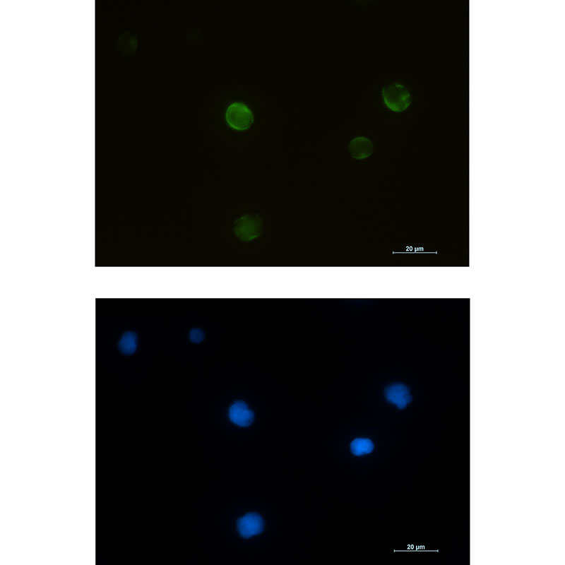 Immunofluorescent analysis of Jurkat cells using db11267 antibody (green), and DAPI (blue).