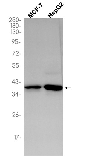 Western blot analysis of extracts from MCF-7,HepG2 cells using db11308 at 1:1000.
