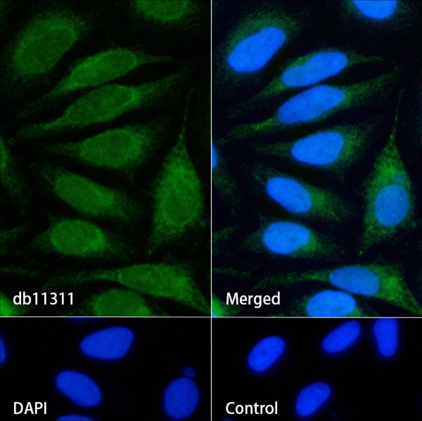 The cells were fixed with 4% PFA (10min, RT) followed by treatment with 0.1% Triton X-100 (10min, RT), and blocked in 1% BSA/10% normal goat serum/0.3M glycine in 0.1% PBS-Tween 20 for 1h. The cells were then incubate with db11311 (1:100) at room temprature for 1h, followed by a further incubation at room temperature for 45min with Goat Anti Rabbit lgG (H+L)-AF488 (