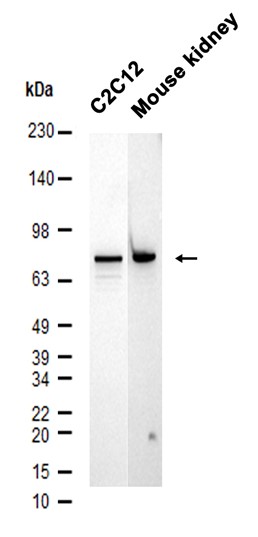 Western blot analysis of extracts from C2C12 cells and Mouse kidney tissue using db11337 at 1:1000.
