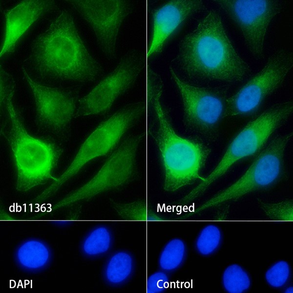 The cells were fixed with 4% PFA (10min, RT) followed by treatment with 0.1% Triton X-100 (10min, RT), and blocked in 1% BSA/10% normal goat serum/0.3M glycine in 0.1% PBS-Tween 20 for 1h. The cells were then incubate with db11363 (1:100) at room temprature for 1h, followed by a further incubation at room temperature for 45min with Goat Anti Rabbit lgG (H+L)-AF488 (