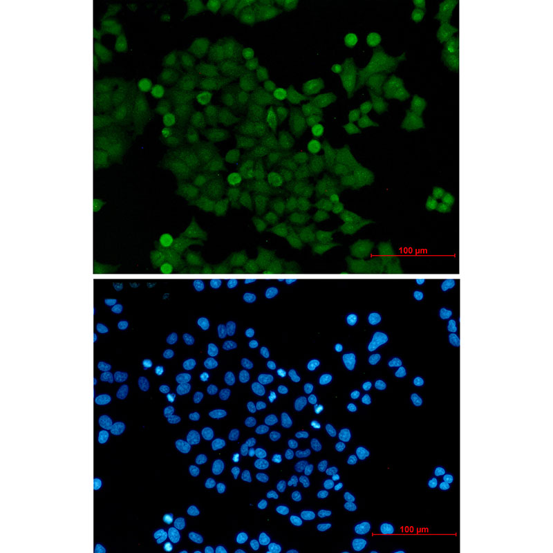 Immunofluorescent analysis of HeLa cells using db11385 antibody (green), and DAPI (blue).