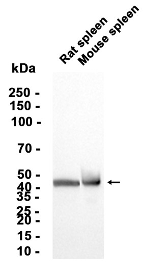 Western blot analysis of extracts from Rat spleen,Mouse spleen tissue using db11393 at 1:2000.