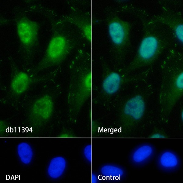 The cells were fixed with 4% PFA (10min, RT) followed by treatment with 0.1% Triton X-100 (10min, RT), and blocked in 1% BSA/10% normal goat serum/0.3M glycine in 0.1% PBS-Tween 20 for 1h. The cells were then incubate with db11394 (1:100) at room temprature for 1h, followed by a further incubation at room temperature for 45min with Goat Anti Rabbit lgG (H+L)-AF488 (