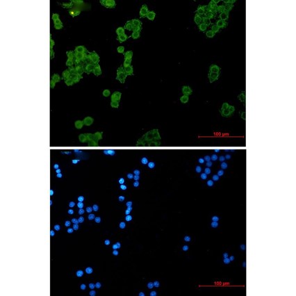 Immunofluorescent analysis of HeLa cells using db11397 antibody (green), and DAPI (blue).