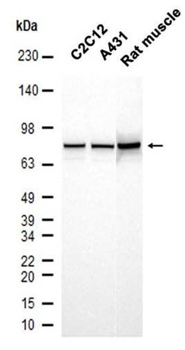 Western blot analysis of extracts from A431, C2C12 cells and Rat muscle tissue using db11397 at 1:5000.