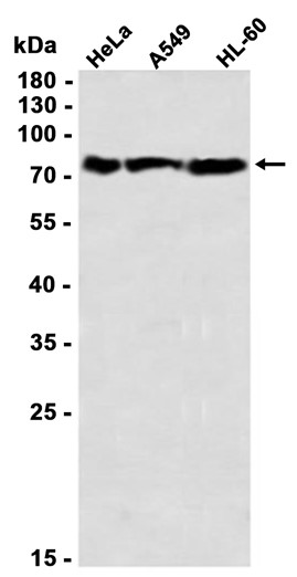 Western blot analysis of extracts from HeLa, A549, HL-60 cells using db11397 at 1:1000.