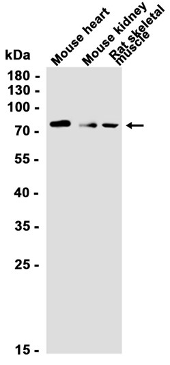 Western blot analysis of extracts from Mouse heart, Mouse kidney, Rat skeletal muscle tissues using db11397 at 1:1000.