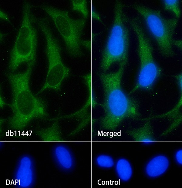 The cells were fixed with cold 100% methanol (10min, 4℃) and blocked in 1% BSA/10% normal goat serum/0.3M glycine in 0.1% PBS-Tween 20 for 1h. The cells were then incubate with db11447 (1:100) at room temprature for 1h, followed by a further incubation at room temperature for 45min with Goat Anti Rabbit lgG (H+L)-AF488 (