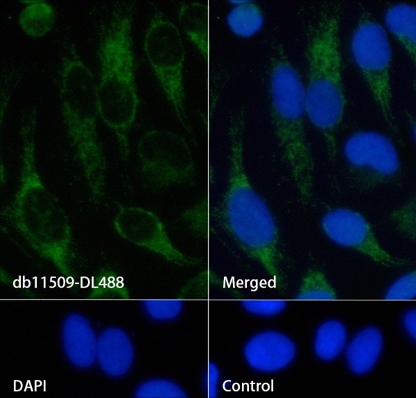 The cells were fixed with cold 100% methanol (10min, 4℃) and blocked in 1% BSA/10% normal goat serum/0.3M glycine in 0.1% PBS-Tween 20 for 1h. The cells were then incubate with db11509-DL488 (1:200,shown in green) at room temprature for 1h. Nuclear DNA was labeled in blue with DAPI.