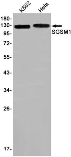 Western blot detection of SGSM1 in K562,Hela cell lysates using SGSM1 antibody(1:1000 diluted).