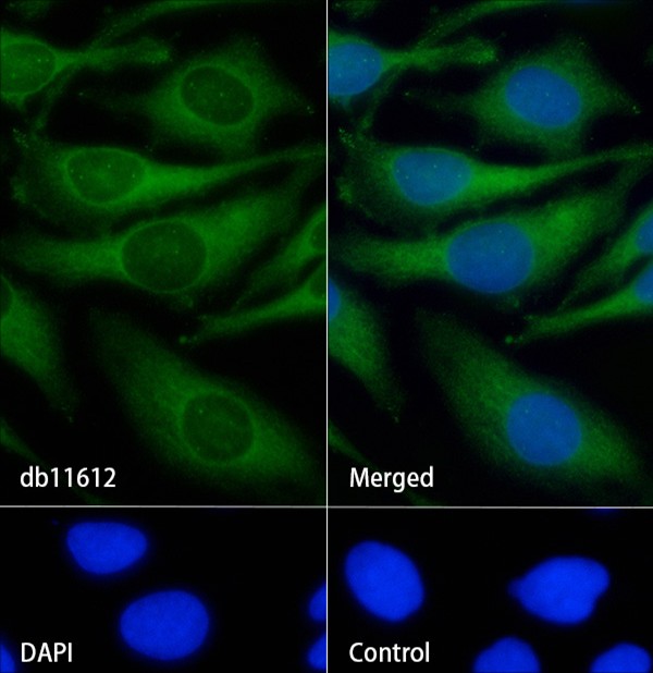 The cells were fixed with cold 100% methanol (10min, 4℃) and blocked in 1% BSA/10% normal goat serum/0.3M glycine in 0.1% PBS-Tween 20 for 1h. The cells were then incubate with db11612 (1:100) at room temprature for 1h, followed by a further incubation at room temperature for 45min with Goat Anti Rabbit lgG (H+L)-AF488 (