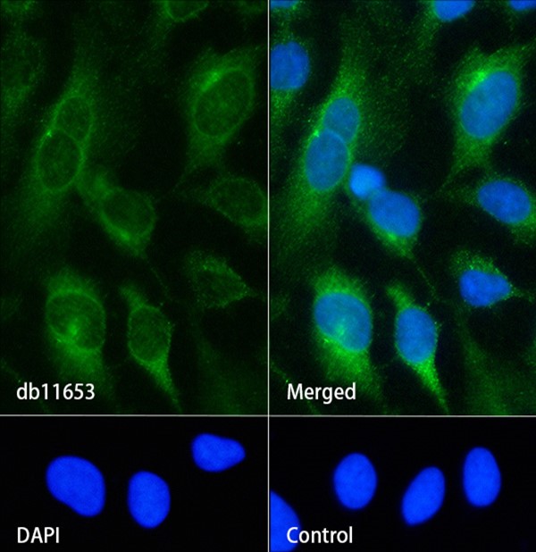 The cells were fixed with cold 100% methanol (10min, 4℃) and blocked in 1% BSA/10% normal goat serum/0.3M glycine in 0.1% PBS-Tween 20 for 1h. The cells were then incubate with db11653 (1:200) at room temprature for 1h, followed by a further incubation at room temperature for 45min with Goat Anti Rabbit lgG (H+L)-AF488 (