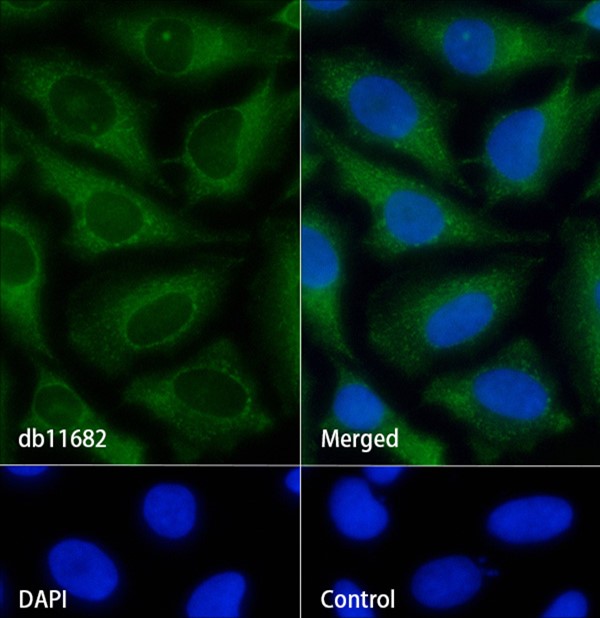 The cells were fixed with cold 100% methanol (10min, 4℃) and blocked in 1% BSA/10% normal goat serum/0.3M glycine in 0.1% PBS-Tween 20 for 1h. The cells were then incubate with db11682 (1:50) at room temprature for 1h, followed by a further incubation at room temperature for 45min with Goat Anti Rabbit lgG (H+L)-AF488 (