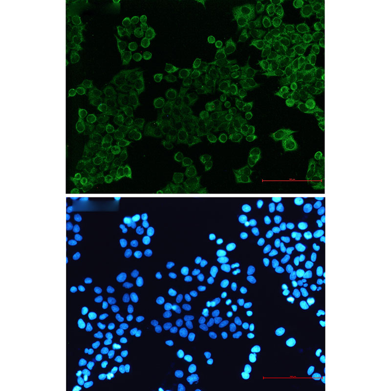 Immunofluorescent analysis of HeLa cells using db11691 antibody (green), and DAPI (blue).