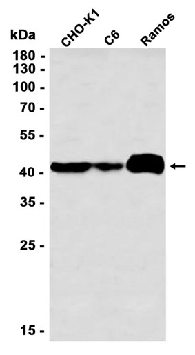 Western blot analysis of extracts from CHO-K1, C6, Ramos cells using db11736 at 1:1000.