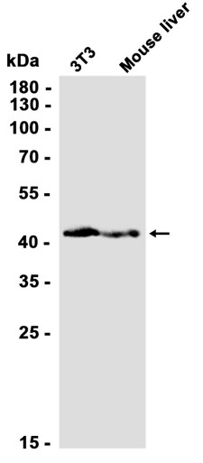 Western blot analysis of extracts from 3T3 cells and Mouse liver tissue using db11736 at 1:1000.