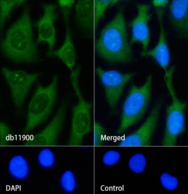 The cells were fixed with cold 100% methanol (10min, 4℃) and blocked in 1% BSA/10% normal goat serum/0.3M glycine in 0.1% PBS-Tween 20 for 1h. The cells were then incubate with db11900 (1:100) at room temprature for 1h, followed by a further incubation at room temperature for 45min with Goat Anti Rabbit lgG (H+L)-AF488 (