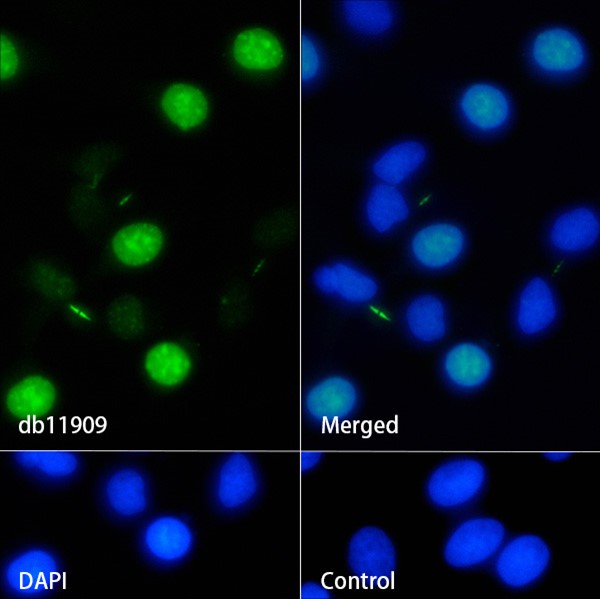 Immunofluorescence analysis of HeLa cells labelling Aurora B with db11909.