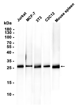 Western blot analysis of extracts from Jurkat, MCF-7, 3T3, C2C12 cells and Mouse spleen tissue using db11929 at 1:1000.