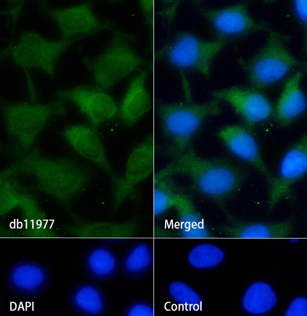 The cells were fixed with cold 100% methanol (10min, 4℃) and blocked in 1% BSA/10% normal goat serum/0.3M glycine in 0.1% PBS-Tween 20 for 1h. The cells were then incubate with db11977 (1:100) at room temprature for 1h, followed by a further incubation at room temperature for 45min with Goat Anti Rabbit lgG (H+L)-AF488 (