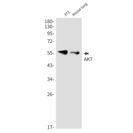 Western blot analysis of AKT in 3T3, mouse lung lysates using AKT antibody(1:1000 diluted).