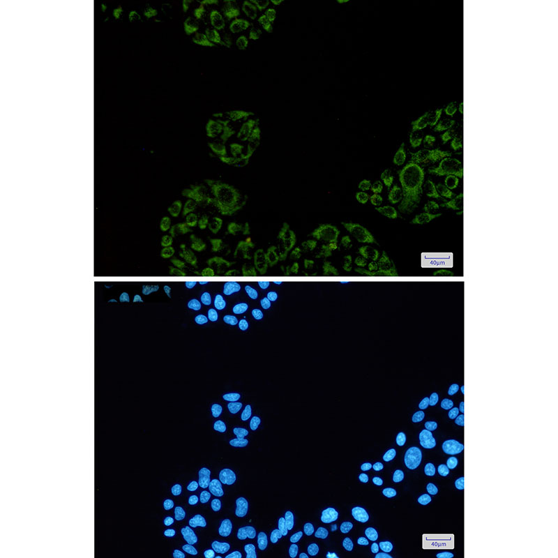 Immunofluorescent analysis of HeLa cells using db12017 antibody (green), and DAPI (blue).