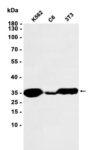 Western blot analysis of extracts from K562, C6, 3T3 cells using db12029 at 1:1000.